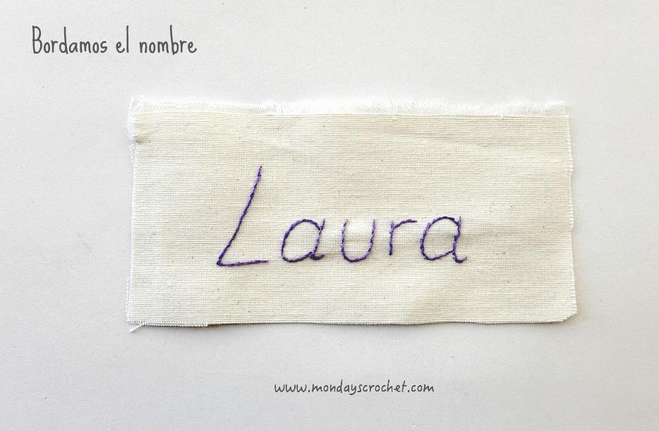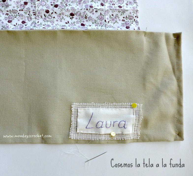 A continuación personalizamos la funda bordando el nombre con hilo de bordar color morado en la tela de algodón color marfil. Centramos la tela personalizada, la prendemos con alfileres y la cosemos a mano con hilo de color marfil.