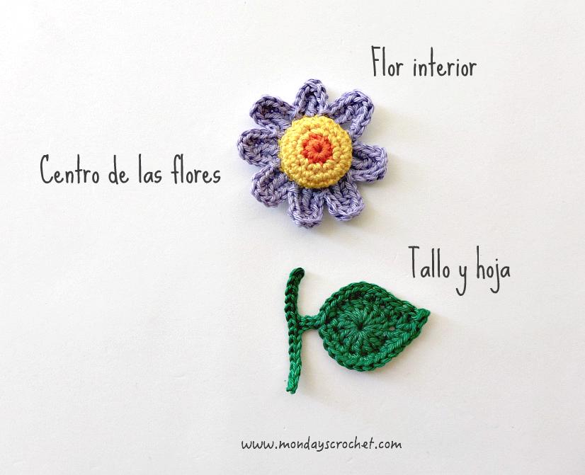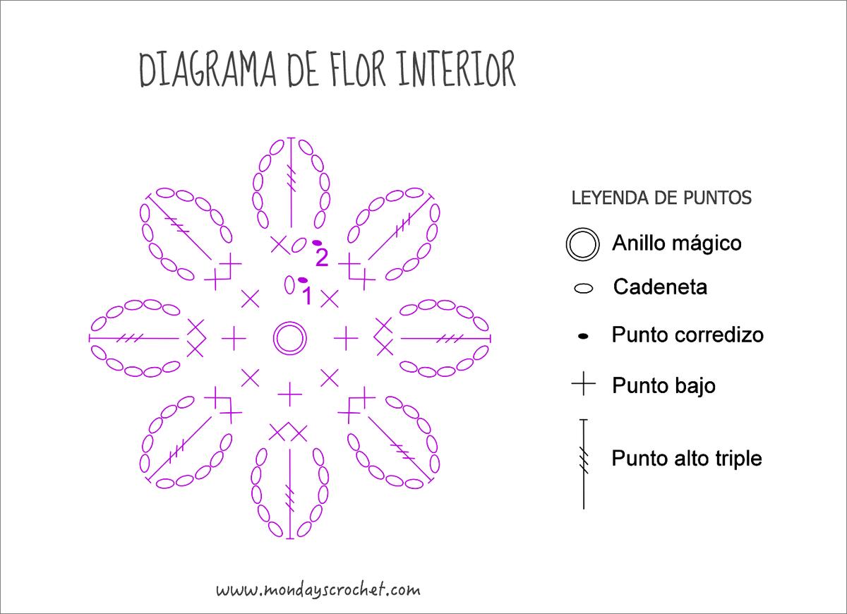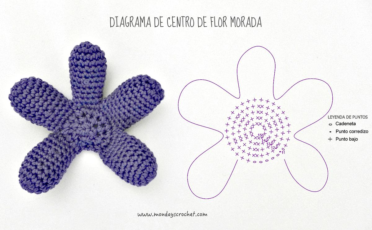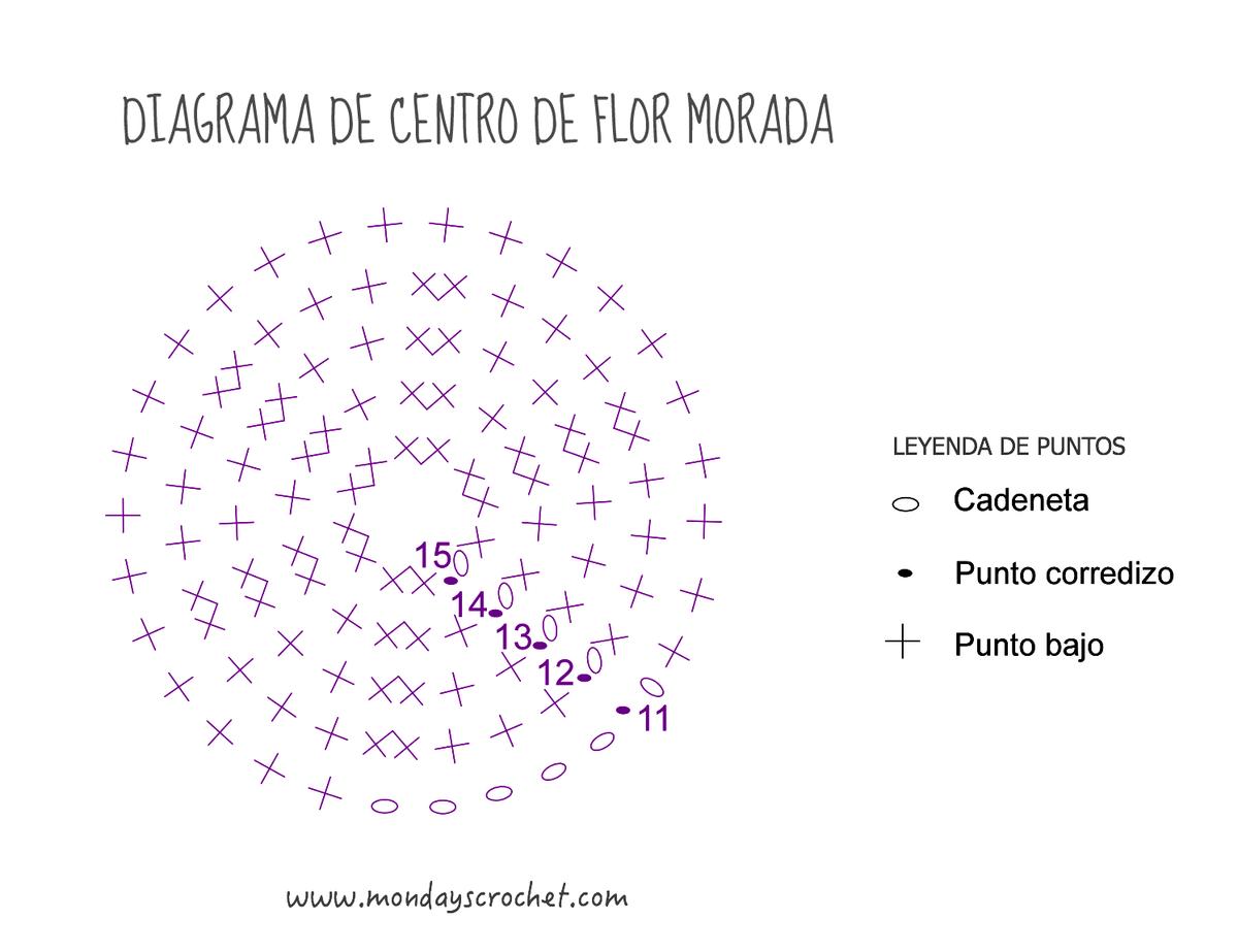 A continuación tejemos la flor interior, el centro de ambas flores y una rama con una hoja. Para tejer la flor interior seguimos este diagrama: Con hilo de color lila.