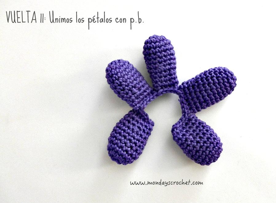 VUELTA 11: Con p.b. unimos los dos lados de cada pétalo y los cerramos. En total 25 p.b. en los 5 pétalos. A continuación tejemos 5 c.a.d. y cerramos con 1 p.c. en el primer pétalo. VUELTA 12: Tejemos 1 c.a.d. y 1 p.b., 3 p.b., 1 disminución 2 p.b., 3 p.b., 1 disminución 2 p.b. Repetimos. Tejemos de la misma forma en las últimas 5 c.a.d. de la vuelta anterior. En total 24 p.b. Cerramos con 1 p.c. VUELTA 13: Tejemos 1 c.a.d. y 1 p.b., 2 p.b., 1 disminución 2 p.b., 2 p.b., 1 disminución 2 p.b. Repetimos. En total 18 p.b. Cerramos con 1 p.c.