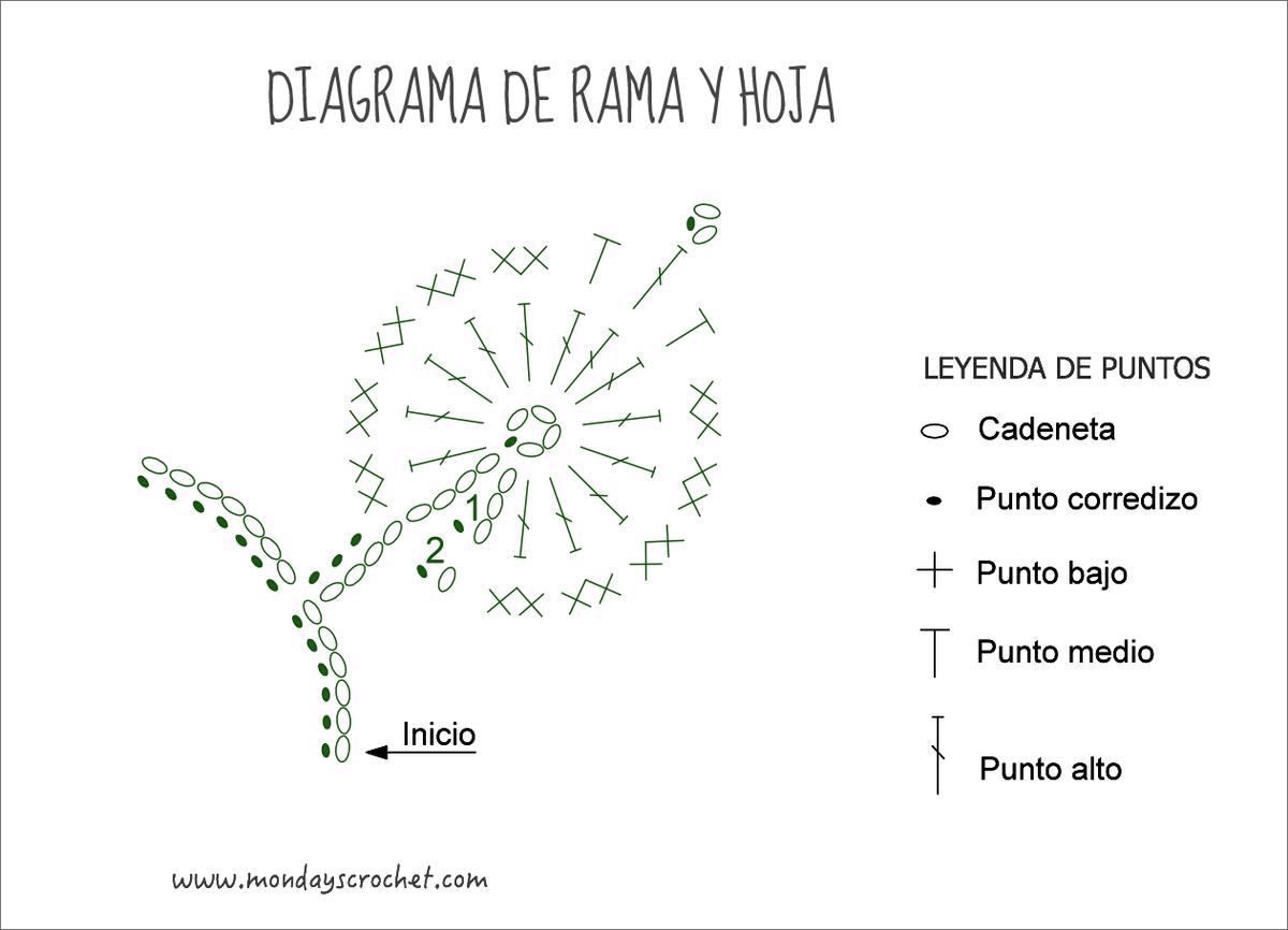 Para tejer una rama y una hoja seguimos este diagrama: VUELTA INICIAL: Tejemos 18 c.a.d. y cerramos con 1 p.c. en la c.a.d. 5 desde el ganchillo.