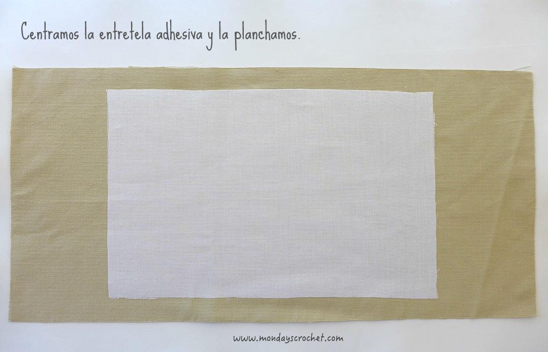 Para reforzar la tela de loneta camel en la zona donde se colocará el cuaderno, vamos a centrar la entre-tela adhesiva de 33 cm de ancho x 21 cm de alto y la planchamos sin aplicar vapor.