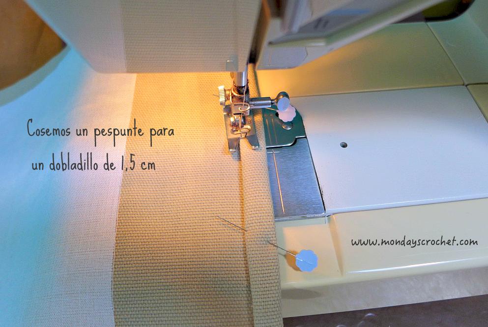 Rematamos los extremos laterales de la funda que quedarán ocultos debajo de las solapas del cuaderno haciendo un dobladillo de 1,5 cm a cada lado. Para ello, cosemos un pespunte con la máquina de coser. Con hilo de color camel, cosemos en la máquina una puntada en zig-zag en la parte superior e inferior de la tela. Hacemos un dobladillo de 1,5 cm y lo prendemos con alfileres.
