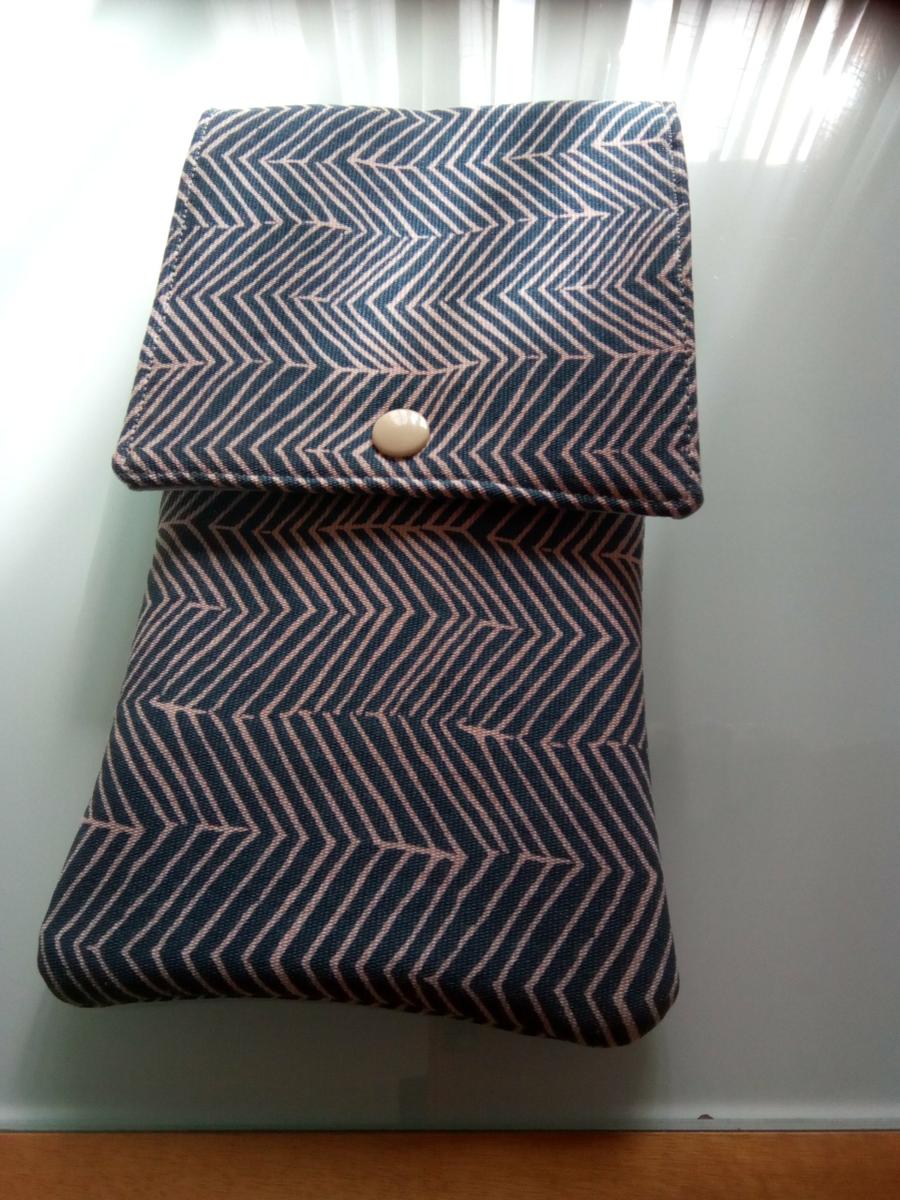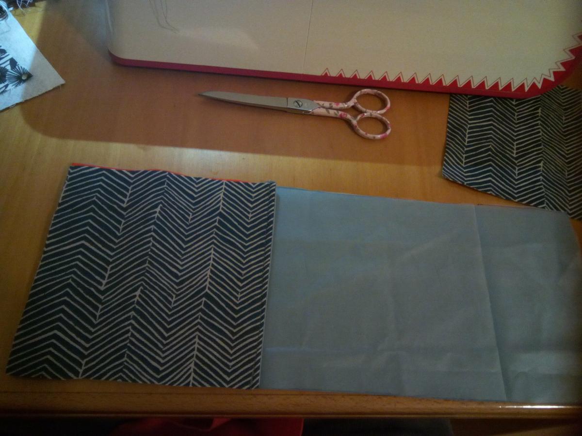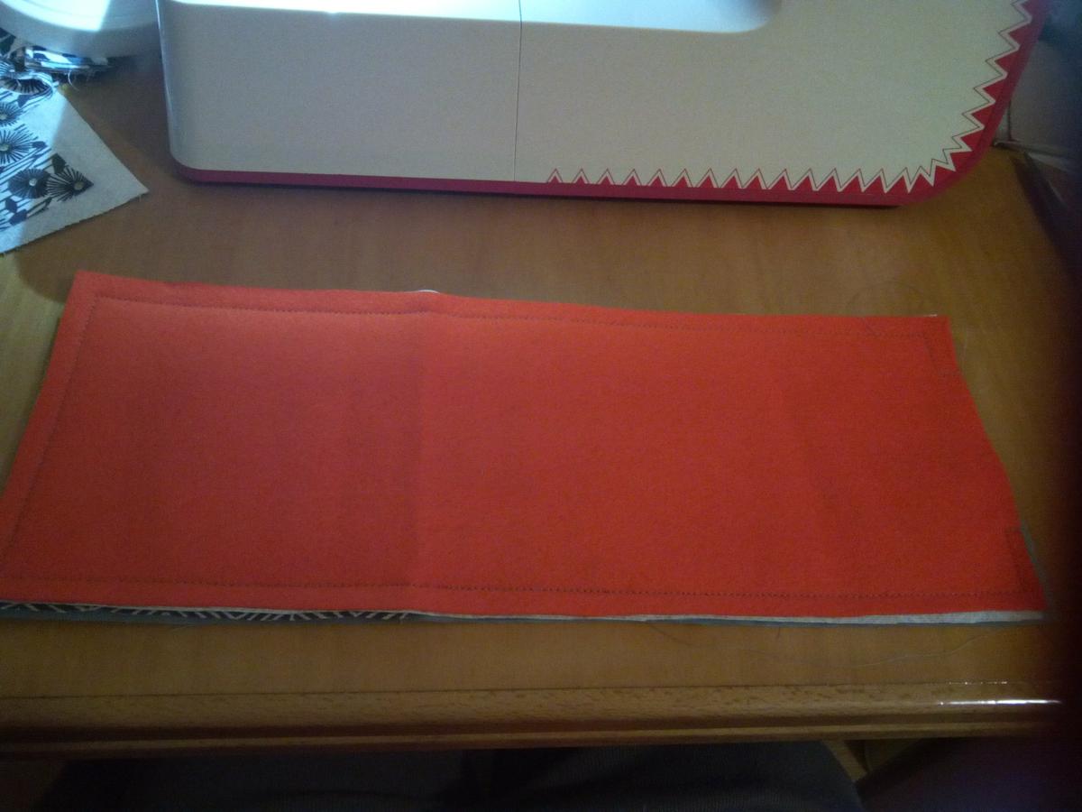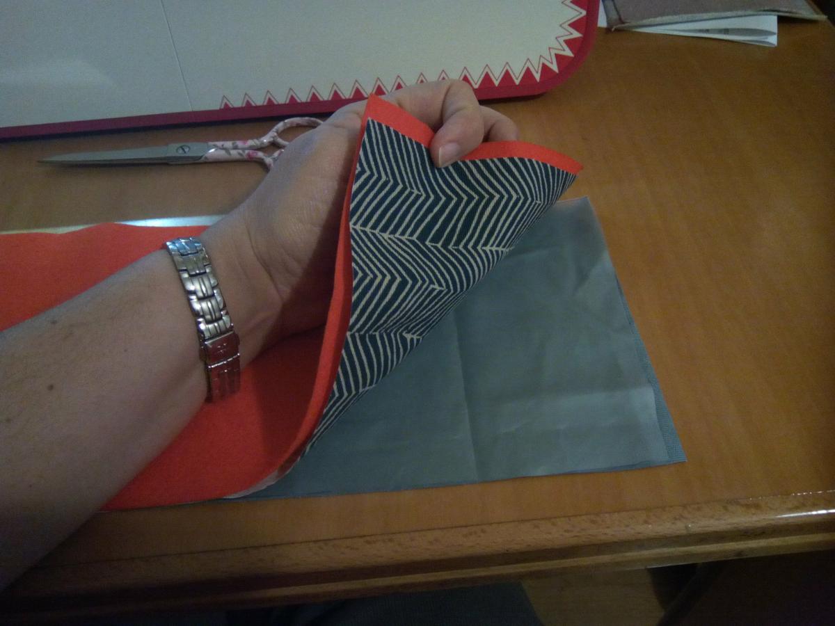 Comenzamos con las telas de la pieza 1. Vamos a colocar el fieltro (en mi caso es naranja para aprovechar un retal que tenía), encima la tela exterior con el derecho hacia arriba, encima el plástico alimentario y por último la tela de forro con el derecho hacia abajo.