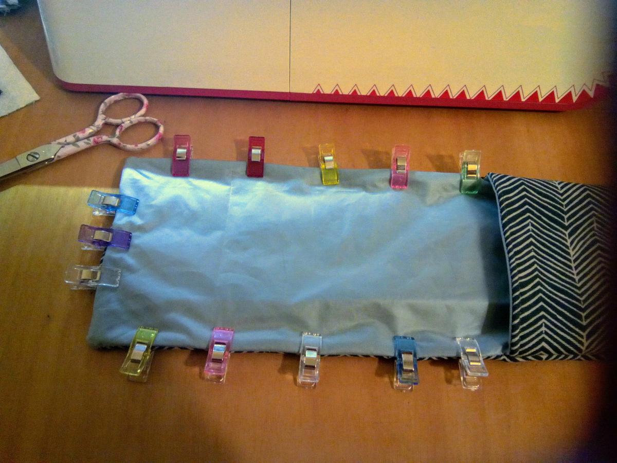 Volvemos del derecho y pasamos un pespunte en U a la zona que veis en las fotos sujeta con las pinzas. Y de esta manera cerramos el hueco que habíamos dejado para darle la vuelta.