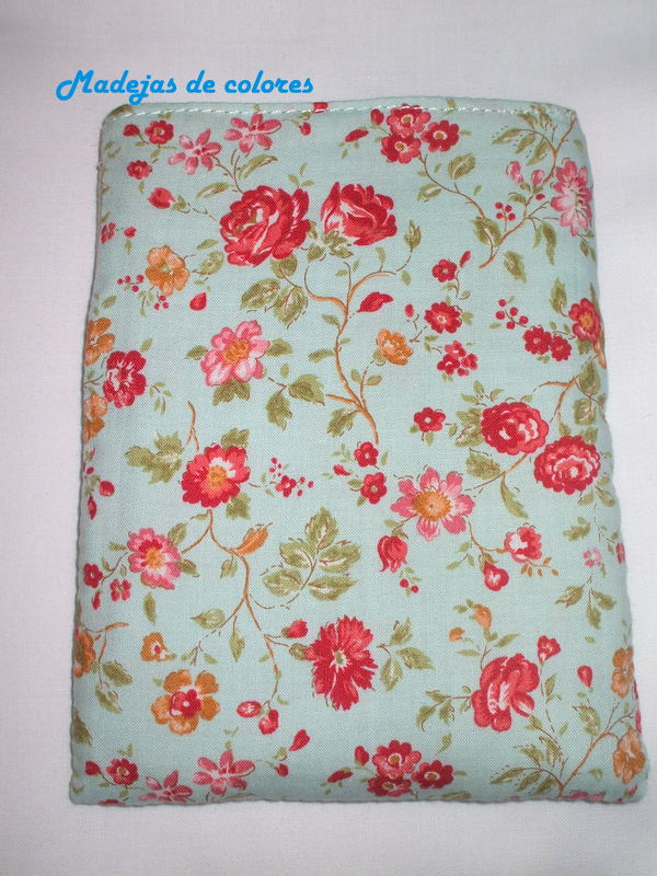 Y como contraste, una cenefa que asoma tímidamente y de trasera, una preciosa tela estampada de flores rojas, sobre fondo verde agua.