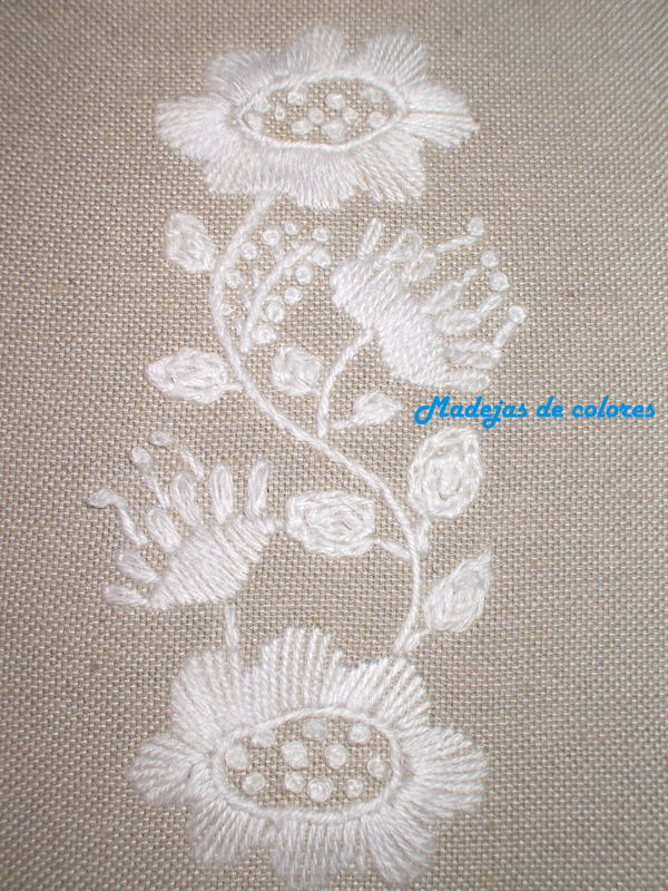 Un sencillo bordado de Yumiko Higuchi de flores blancas sobre un fondo natural, para que destaque. La novedad es que lo hice con lana de hacer punto.