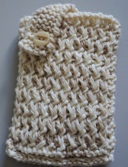 Esta tejida toda de una pieza. Monte los puntos necesarios según la anchura del móvil y tejí en recto el doble de la altura del móvil, cosiendo después las costuras laterales. Para cerrarla cruce una tira tejida a punto bobo o Santa Clara poniendo un botón en cada parte. La tira se abre con el botón tostado pequeño mientras que el botón grande de color marrón es meramente decorativo.