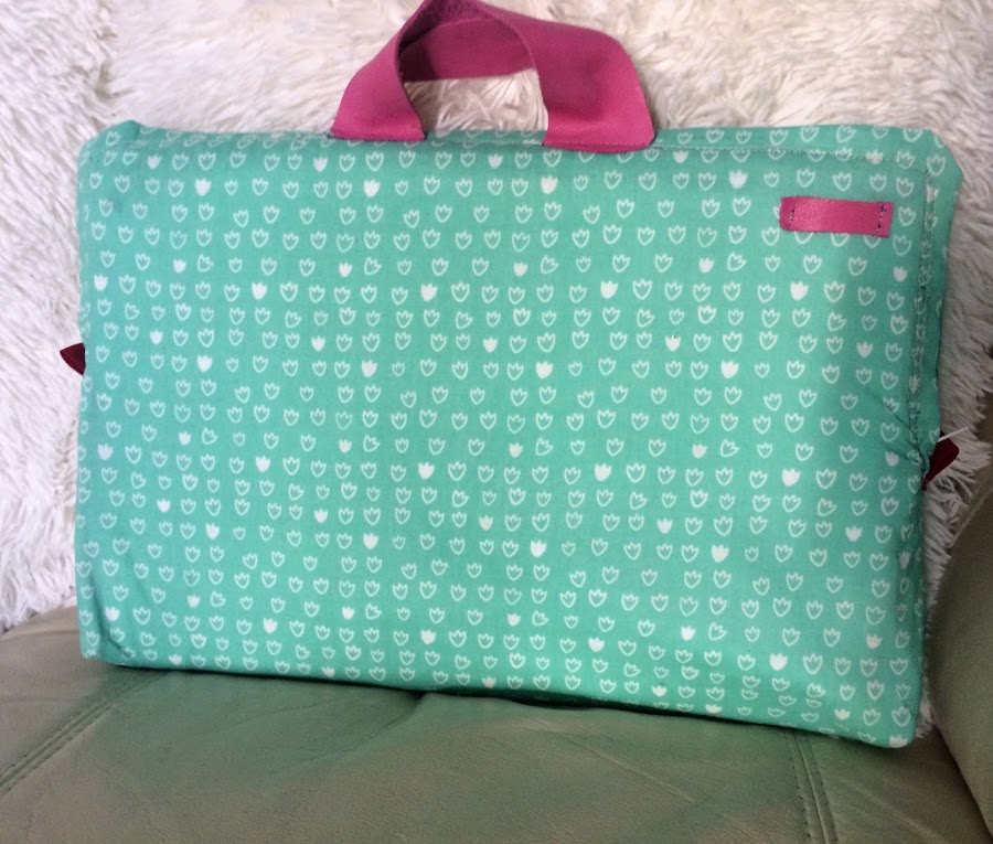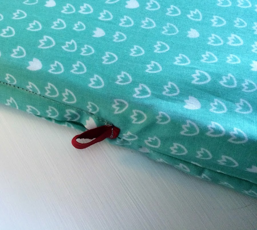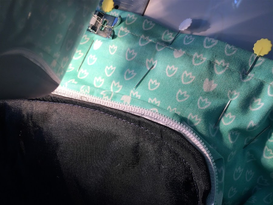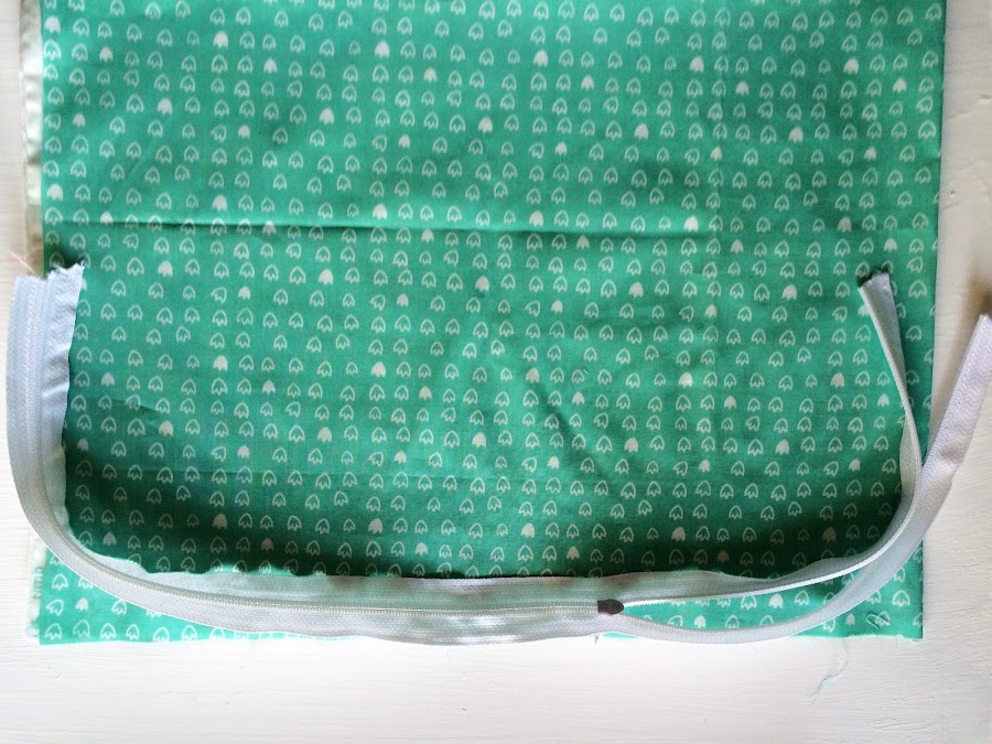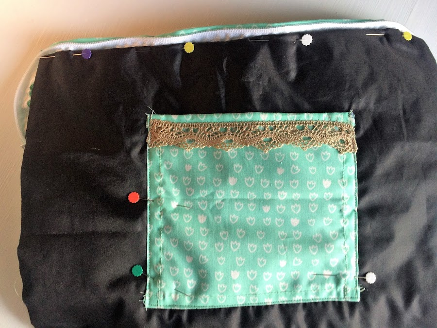 En la guata cosí de la misma tela de tulipanes un bolsillo interior con una puntilla, puse las dos piezas juntas revés con revés y le cosí la cremallera de la mitad lateral hasta la otra mitad lateral.