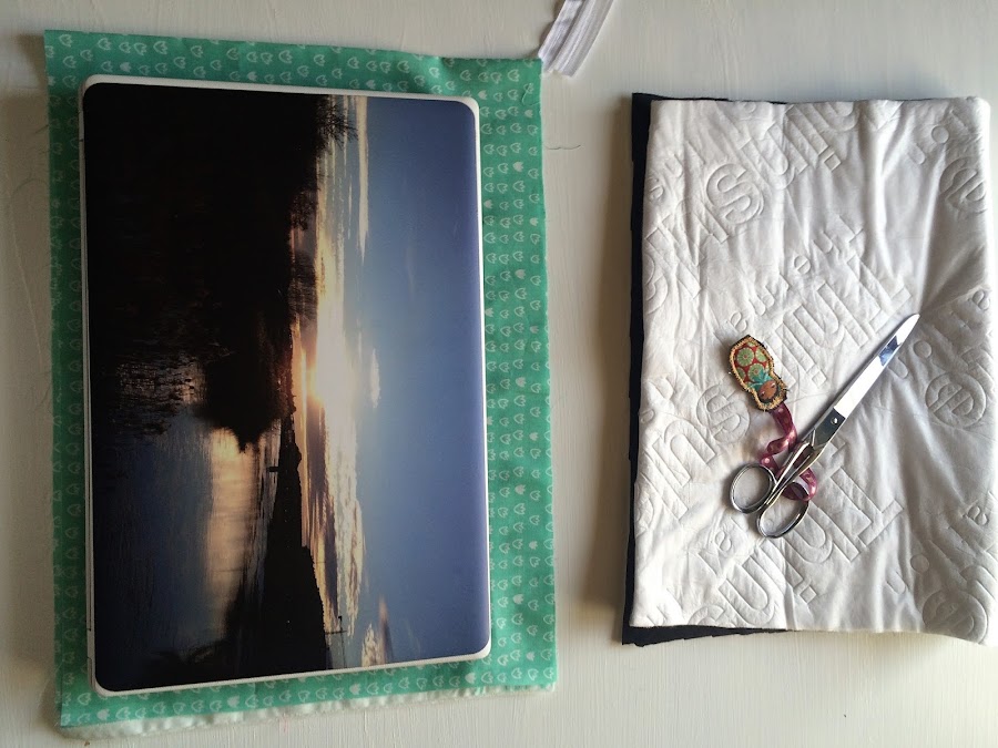 Yo corte dos rectángulos de tela con 3 cm. más por cada lado que la medida del portátil, para las costuras y los cantos de la funda. Esto lo corte tanto en la tela como en la guata.