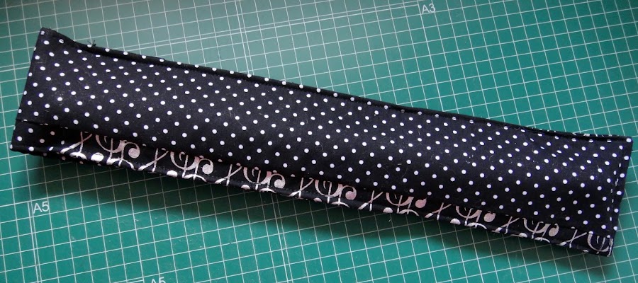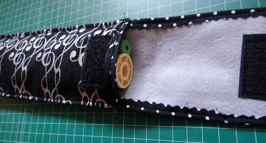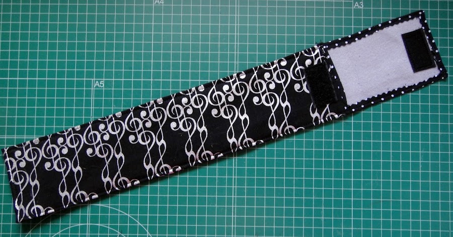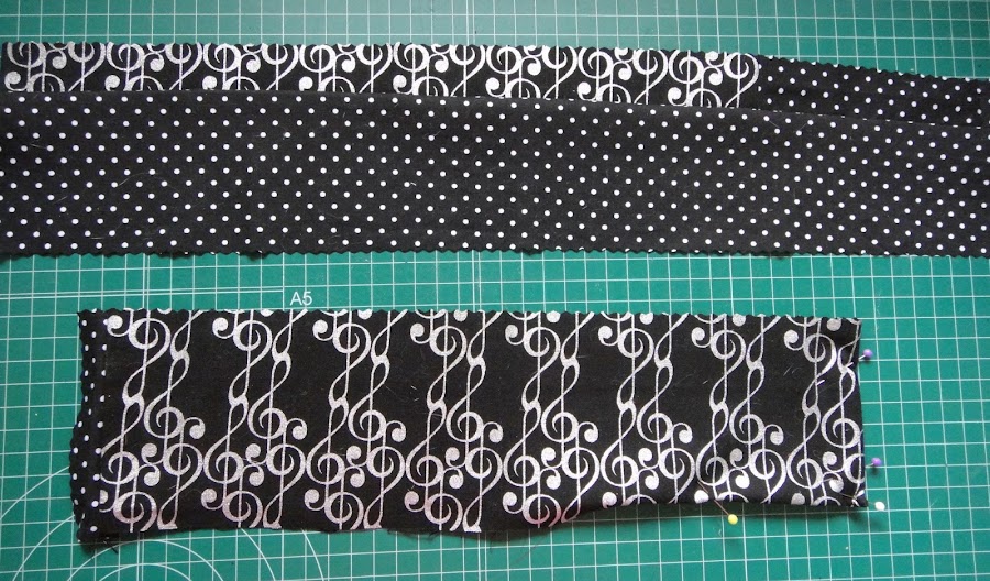 -Dos rectángulos de tela de 36.5x9.5 y 47.5x9.5 cm. Como no tenía tela de claves de sol suficiente, he unido otro retal de tela de lunares, para conseguir los dos rectángulos que necesito.