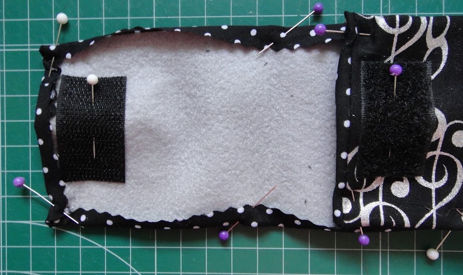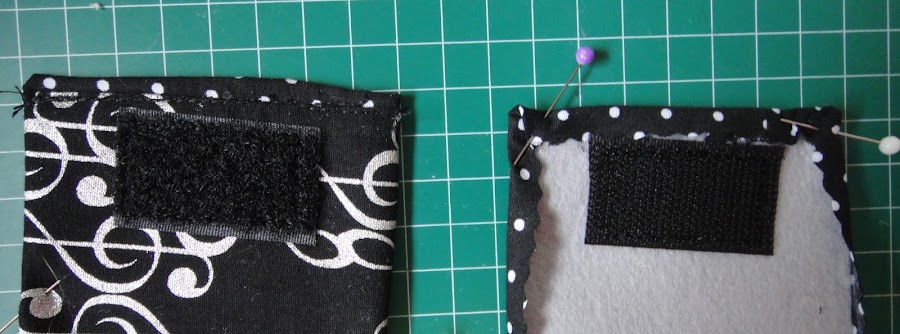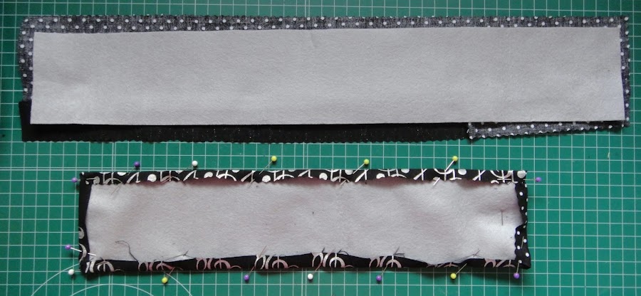 Situamos los dos rectángulos de fieltro sobre el revés de los dos de tela, y sujetamos con alfileres todos los bordes. Planchamos para fijar el dobladillo.