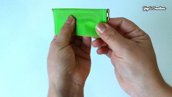 Ahora, dejaremos la pieza de fieltro así como está del revés y a la pieza principal le daremos la vuelta y colocaremos encima y por el borde, las piezas donde irá el fleje, con la parte del doblez hacia abajo, de manera que cuando la pongamos del derecho quede hacia afuera como ves en el resultado final.