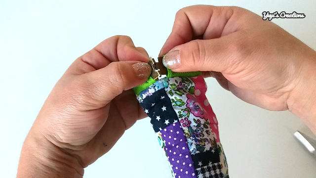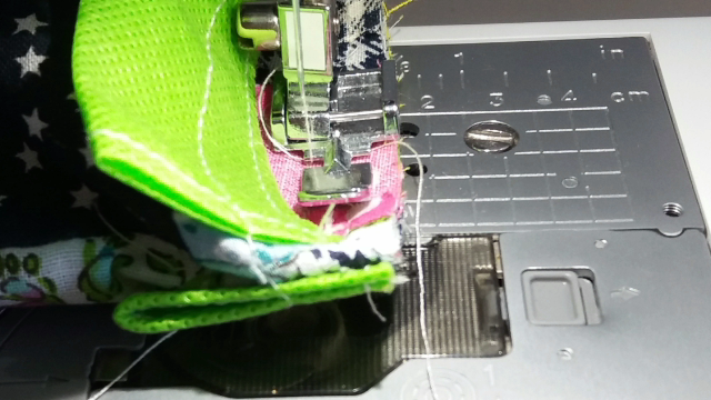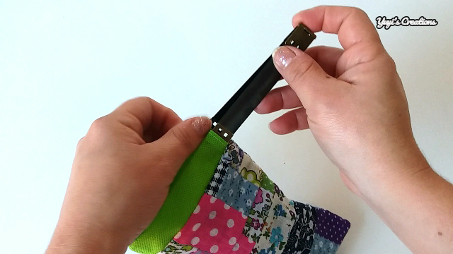 Ahora, a la pieza de 8x11,5 cm le vamos a coser un pequeño dobladillo por los lados más cortos, y medimos para comprobar que el fleje encaje perfectamente y luego cosemos a 1,5 cm del borde del fleje para cerrarla.