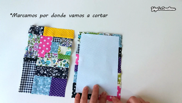 Lo primero será unir los retales de tela, siempre enfrentando sus derechos. Hacemos esto hasta completar una pieza del tamaño del patrón. Si es necesario, cortamos lo que pueda sobrar: