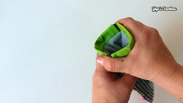 Ahora metemos la pieza principal que está del derecho, dentro del forro que está del revés, hacemos coincidir las costuras laterales y cosemos nuevamente justo por la costura anterior.