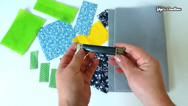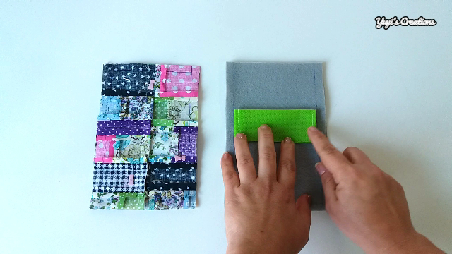 Ahora marcamos en la tela principal y en el fieltro 1 cm por todos sus lados (para costura) comprobando la medida del ancho con la pieza donde irá el fleje, porque esta pieza debe quedar al ras del ancho de las otras así:
