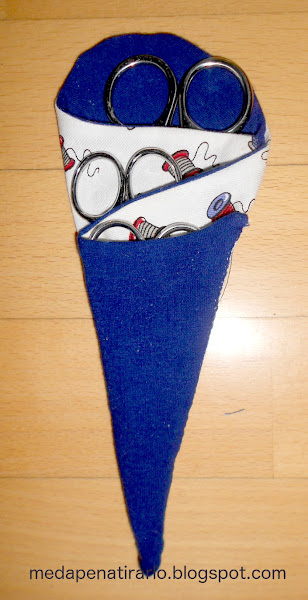 Aprovechando un trozo pequeño de una tela ideal para asuntos de costura que me sobró de hacer las bolsas para los pedales de la máquina de coser, me puse a hacer la imprescindible funda para el juego de tijeras que tiene todo el mundo.