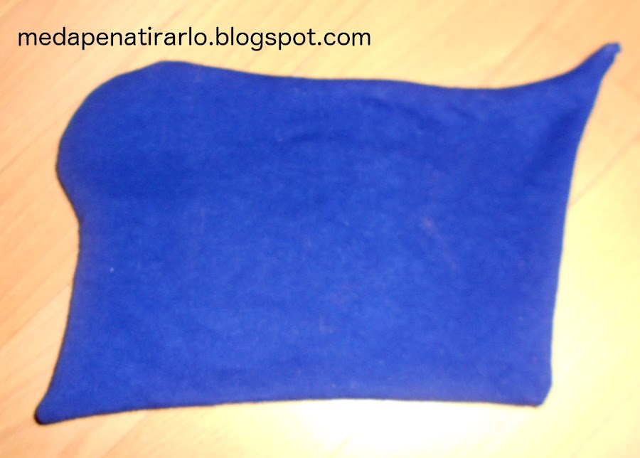 El patrón se inspiró en uno muy corriente (por ejemplo, reflejado en esta página) pero lo tuve que retocar porque no se ajustaba al tamaño de mis tijeras. Aproveché tele de camiseta pequeña y manchada y un retal viejuno estampado; se cose el reborde del patrón con la máquina, acabando el agujero para dar la vuelta con puntada escondida. Aquí es donde veo el principal fallo de esta labor: requiere de entretela, capa acolchada o del uso de unas telas muy recias; de lo contrario el resultado es blando y las tijeras se caen, porque la funda no es suficientemente rígida. No aguanta bien el peso de las tijeras.