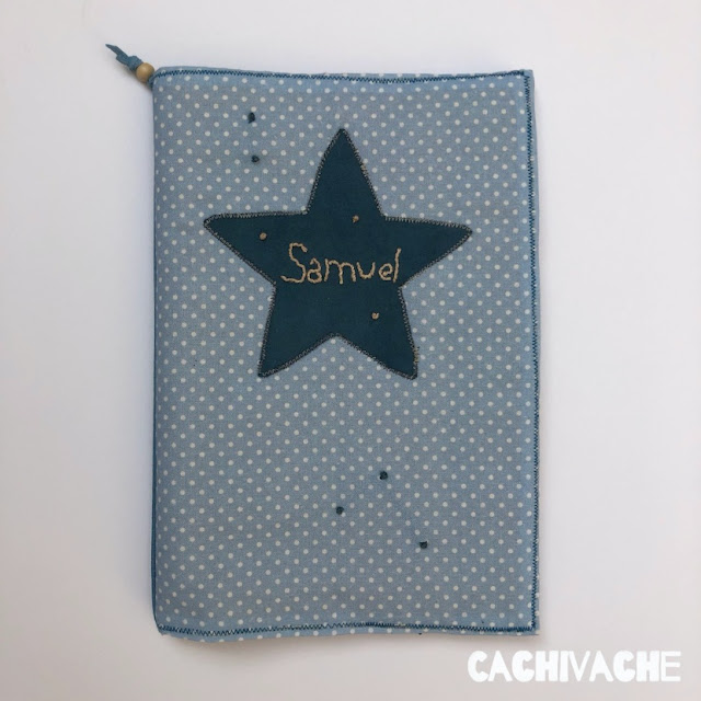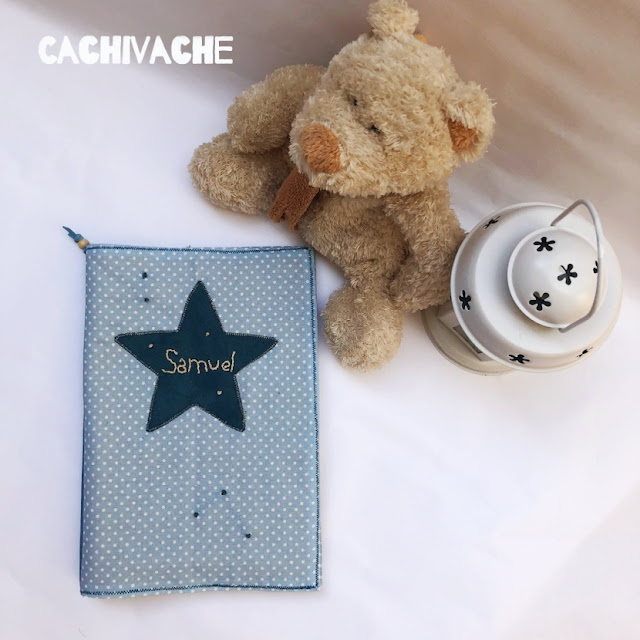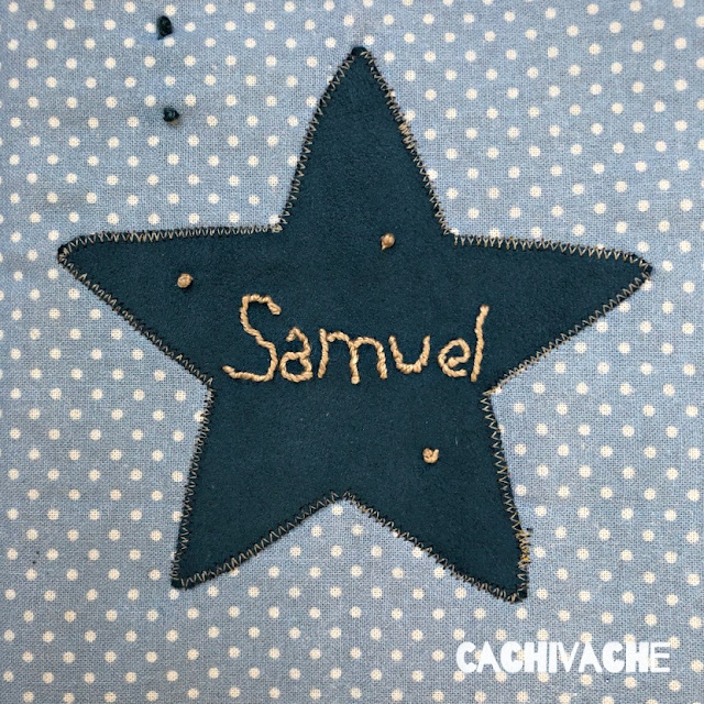 La tela elegida para confeccionarla es azul celeste con tópicos en blanco y su nombre bordado en una estrella en el centro. Como ves muy sencillo pero elegante y práctico a la vez.