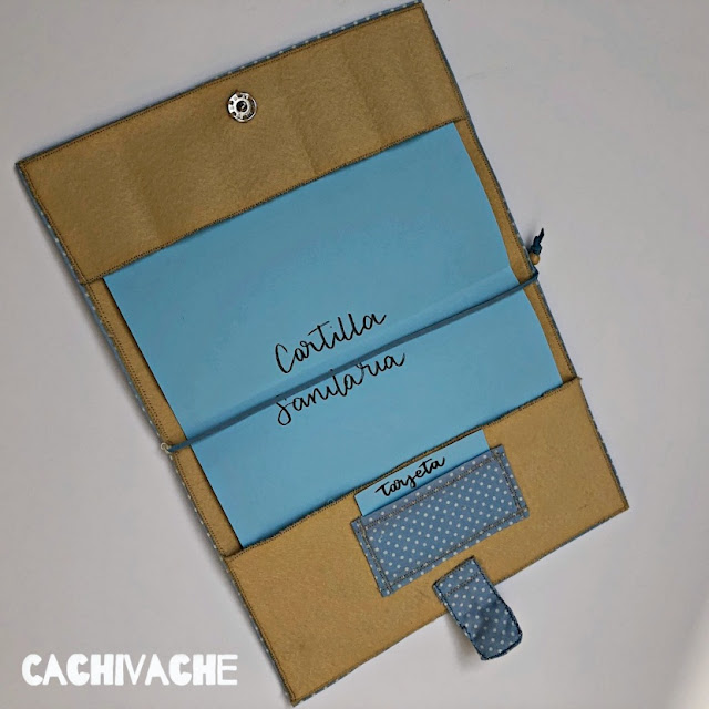 Su interior en fieltro color beige lleva dos bolsillos para introducir las portadas de la carpeta y que quede acoplada y protegida. También un bolsillo interior donde poder poner la tarjeta sanitaria y que vaya todo junto.