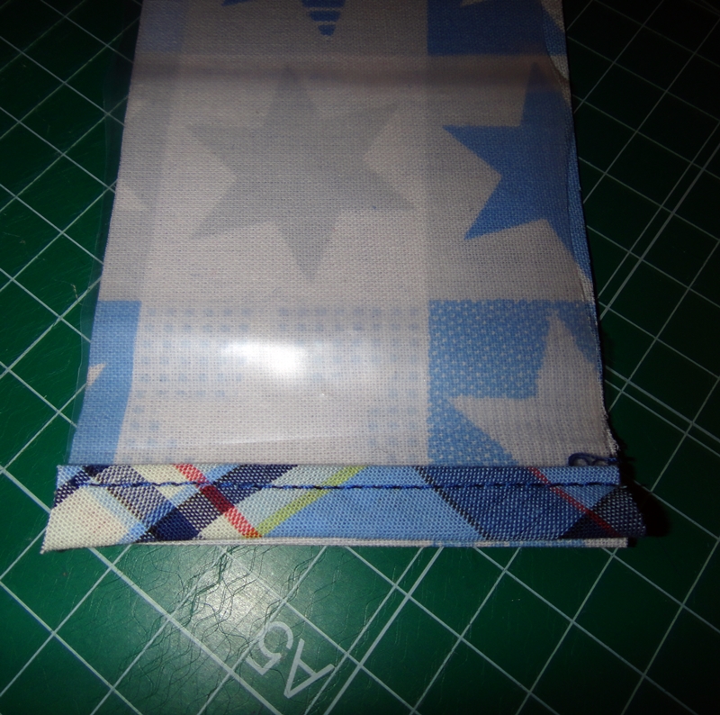 Cosemos primero una tira de bies en uno de los lados cortos del plástico.