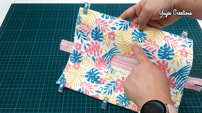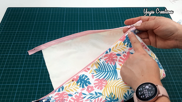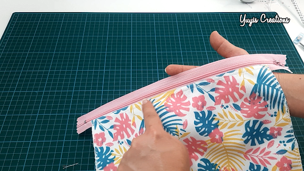 Ahora vamos a pasar un zigzag o sobrehilado por todo el borde para unir ambas piezas en una sola. Luego para poner la cremallera doblamos un lado a medio centímetro o justo por donde hemos sobrehilado, planchamos para que mantenga su forma y ponemos esto encima de la cremallera y cosemos por el borde como te muestro en la imagen de abajo. Y hacemos lo mismo con el otro lado.