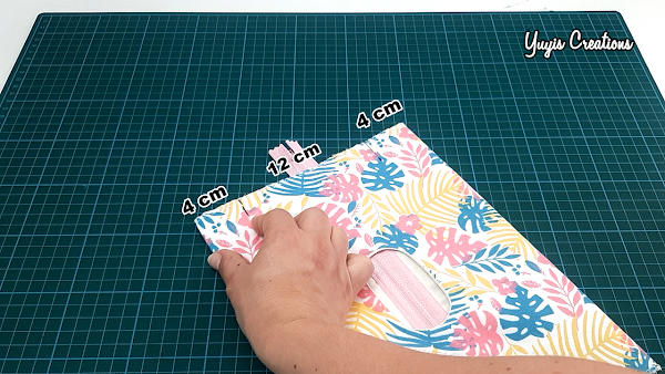 Puesta la cremallera, colocamos nuestra funda como ves en la imagen de abajo, centrando la cremallera en el agujero de la tapa. Hacemos luego un par de marcas a los 4 cm de los bordes, quedando la pieza distribuida como te muestro a continuación.