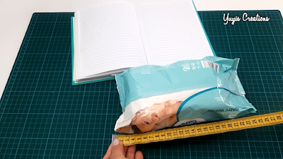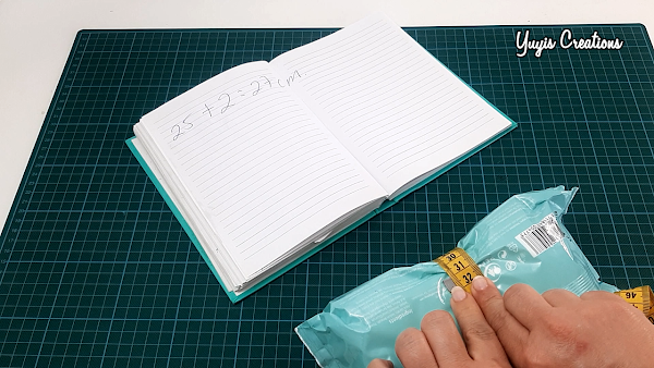 Vamos a empezar tomando las medidas del paquete de toallitas. medimos el largo y a esa medida de sumamos 2 cm para el margen de costura. Como ves en la imagen de abajo, mis toallitas miden 25 cm+ 2 cm= 27 cm.