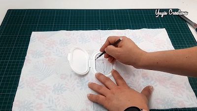 Vamos a empezar pegando la vlieseline o entretela a nuestra pieza de tela principal. Lo planchamos sin vapor. Hecho esto, por la parte del revés ubicamos el centro de la pieza de tela y marcamos el contorno de la tapa de las toallitas, tal como te muestro en la imagen de abajo.