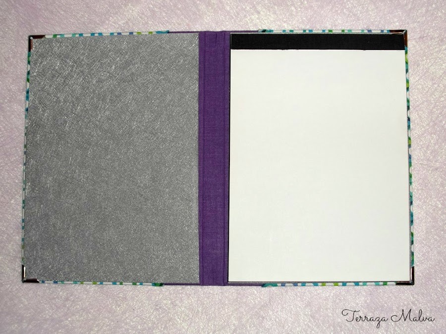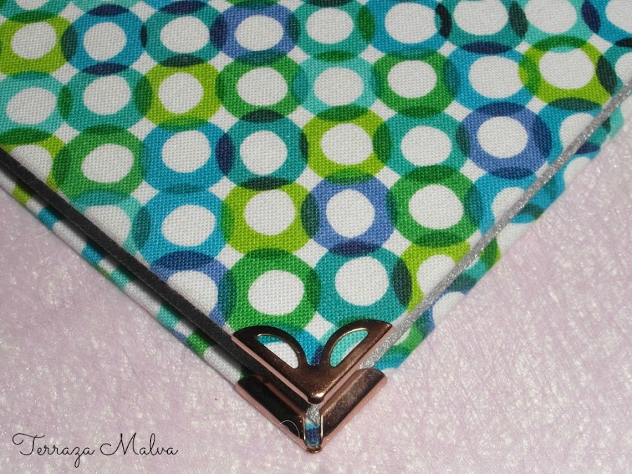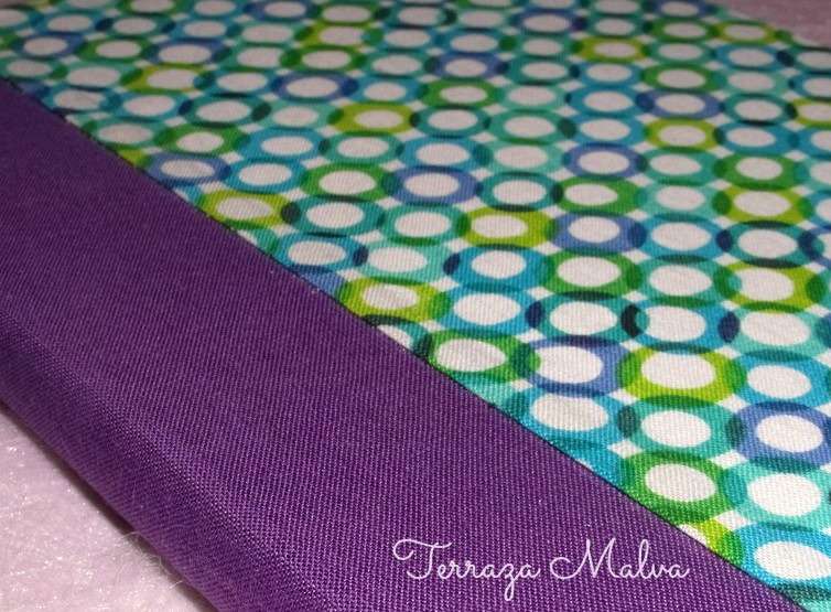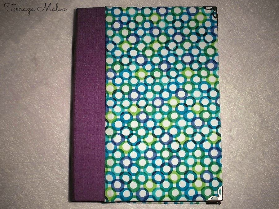 He elegido para el encuadernado una tela de algodón con motivos circulares en tonos azules y verdes. En el lomo he utilizado una tela también de algodón en tono malva.