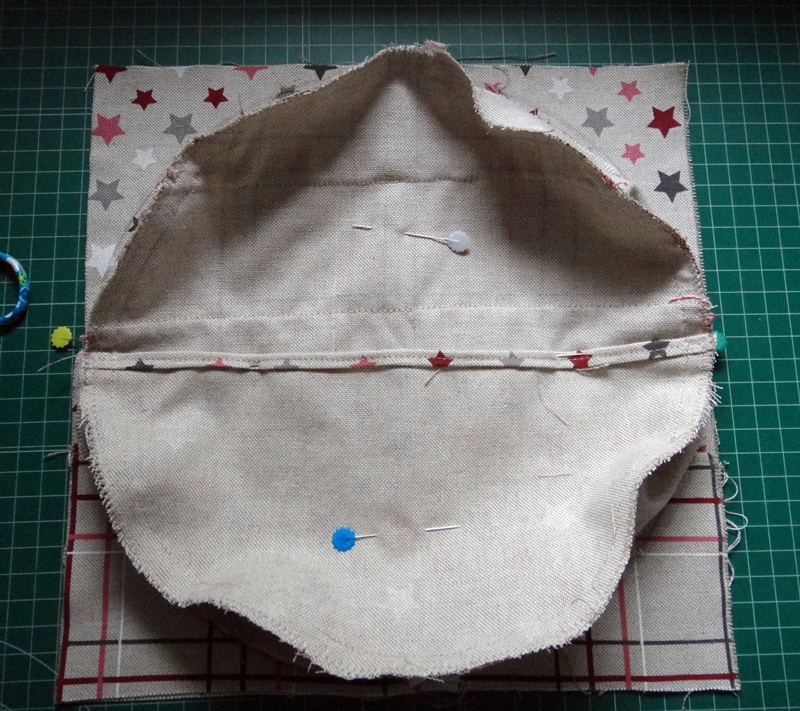 Cogemos dobladillo en todos los bordes de las telas, y aprovechamos para coser la cinta que sujetará el botón.
