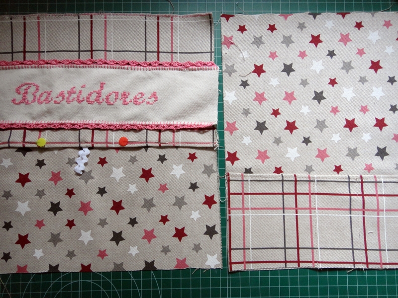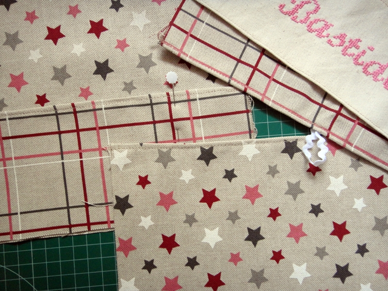 Bordamos las letras en la tira pequeña. Si utilizáis las que venden ya hechas con tela aida no tendréis más que bordar y aplicar. Si lo hacéis con una tira de tela cualquiera podéis añadir una pequeña puntilla de ganchillo como la mía.