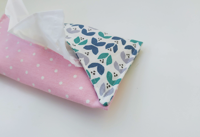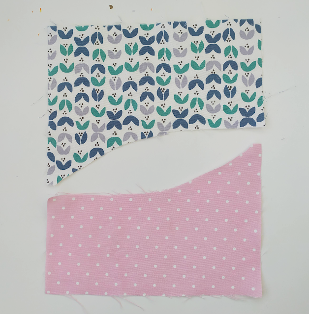 Antes de ponernos a coser nuestra funda para los pañuelos tenemos que dejar nuestros trozos de tela preparados con esta forma. Los cortaremos en espejo dos a dos, encarando los derechos de las telas iguales. En el video te cuento como hacerlos.