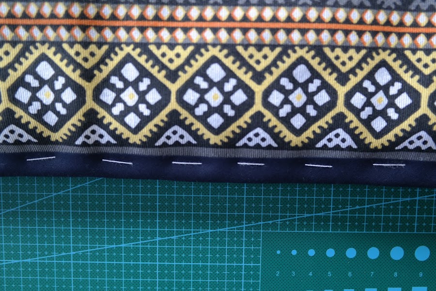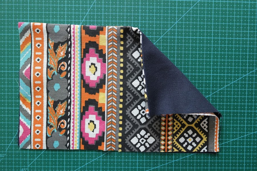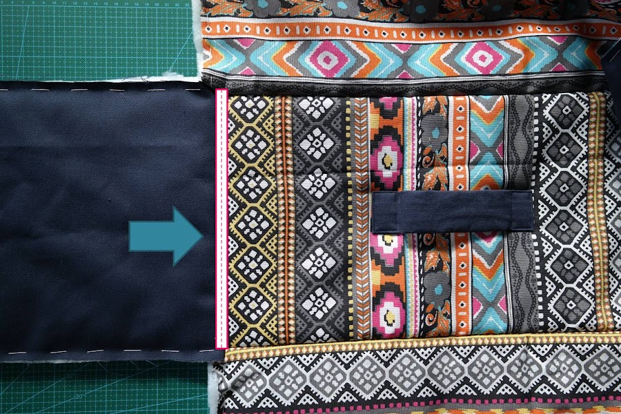 El siguiente paso es comenzar a unir las piezas. Cose uno de los lados largos de la tapa con otro de los lados de largos del frontal, enfrentando derechos.