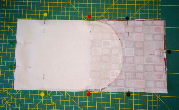 Cose (derecho contra derecho) la parte redondeada que corresponde a la solapa, y la parte superior de las piezas cuadradas.