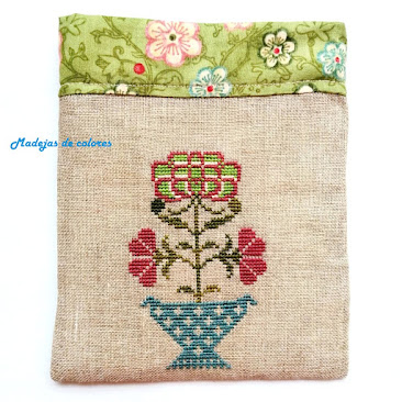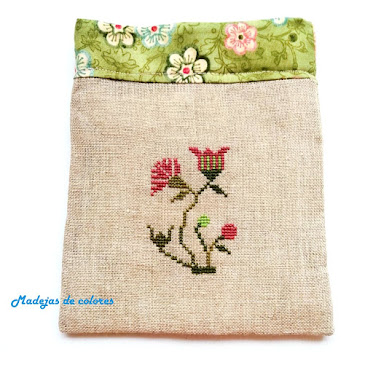 Esta vez he optado por el punto de cruz, con motivo primitive, diseño de "Stacy Nash", en concreto unas flores, sobre lino natural.