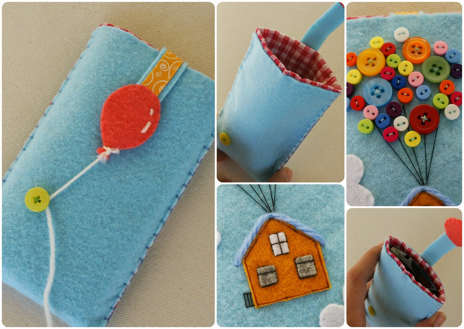 La funda está hecha en fieltro y forrada por dentro con una telita de cuadritos rosas y blancos, los "globos" como veis son botoncitos, y se cierra atando el cordón del globo grandullón en el botón de la parte trasera.