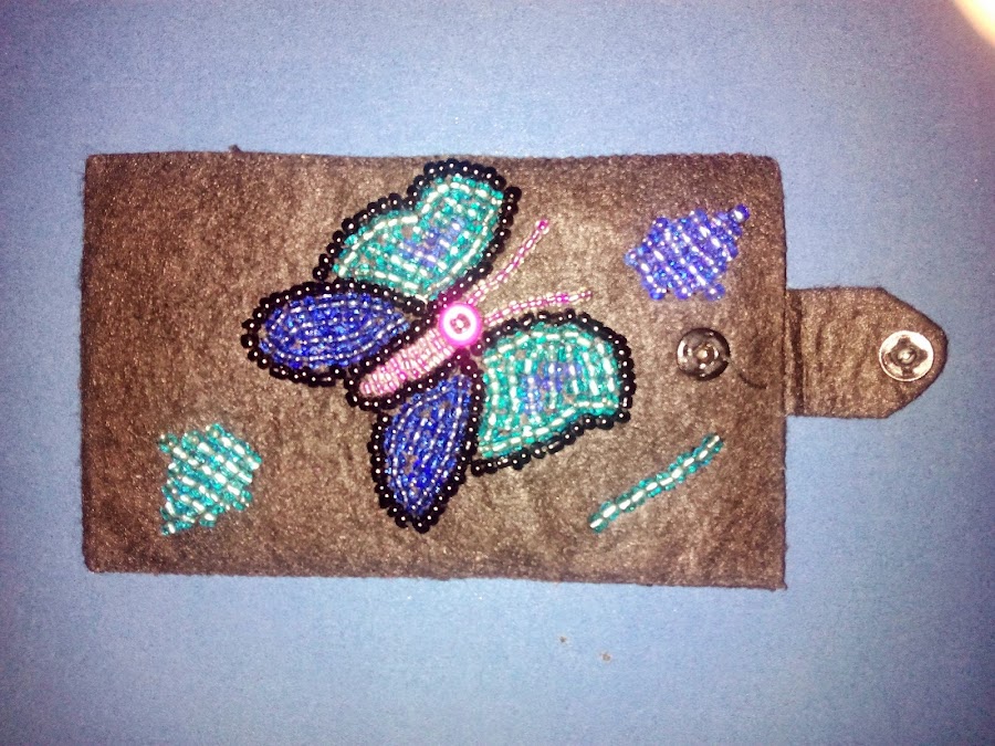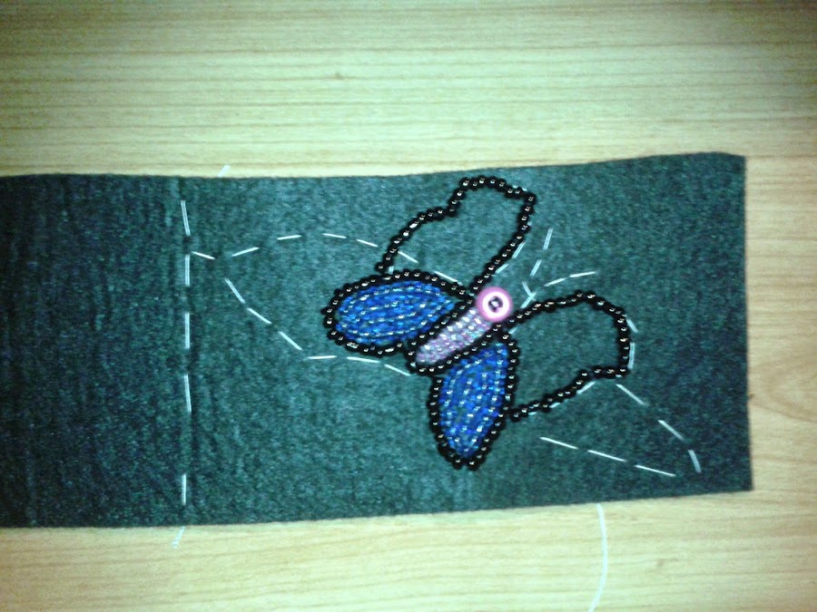 Elaboración:1. Tomamos las medidas del móvil para el que queremos hacer la funda del móvil. Una vez que tenemos las medidas cortamos el fieltro en forma rectangular para luego solo tener que coser los dos extremos laterales. Y señalamos la mitad ya que en una de esas mitades vamos coser los abalorios.