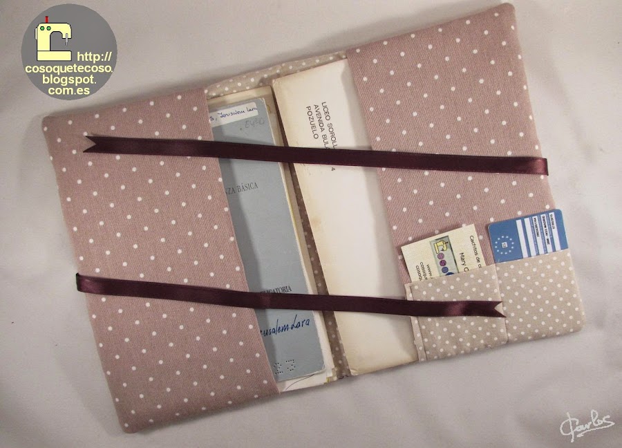El forro y el tarjetero en tela de algodón de lunares, y las solapas en loneta, también de lunares, pero un tono más oscuro para que contraste.