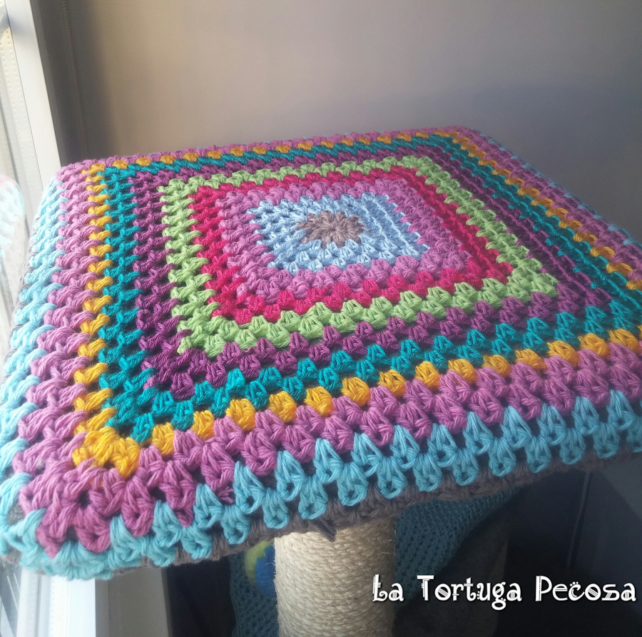 Desde que llegó el nuevo rascador de mis queridas felinas, no las veía al 100% con él, en el sentido que, no pasaban el tiempo que esperaba en él, debo decir que es inmensamente gigante. así que, decidí personalizarlo con hilo de algodón y la tecnica del granny square.