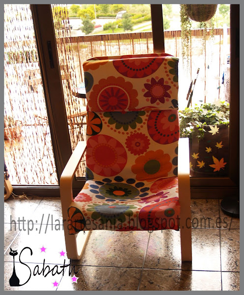 Este sillon es el modelo Pello al muy asequible precio de 30? y os puedo asegurar que son muuuuy resistentes aunque a primera vista no lo parezcan, la tela que use tambien de ikea, nombre Fredika a 4,99 ? el metro, una loneta bastante resistente, la pena de estas telas es que el ancho solo da 1,50, asi que para segun que trabajo se queda corta, este sillón es el de mi hija, hay dos mas en casa pero necesitan otro cambio, ya les llegara su momento, eso si le he de hacer un cojín de coloraines que haga juego con el sofa