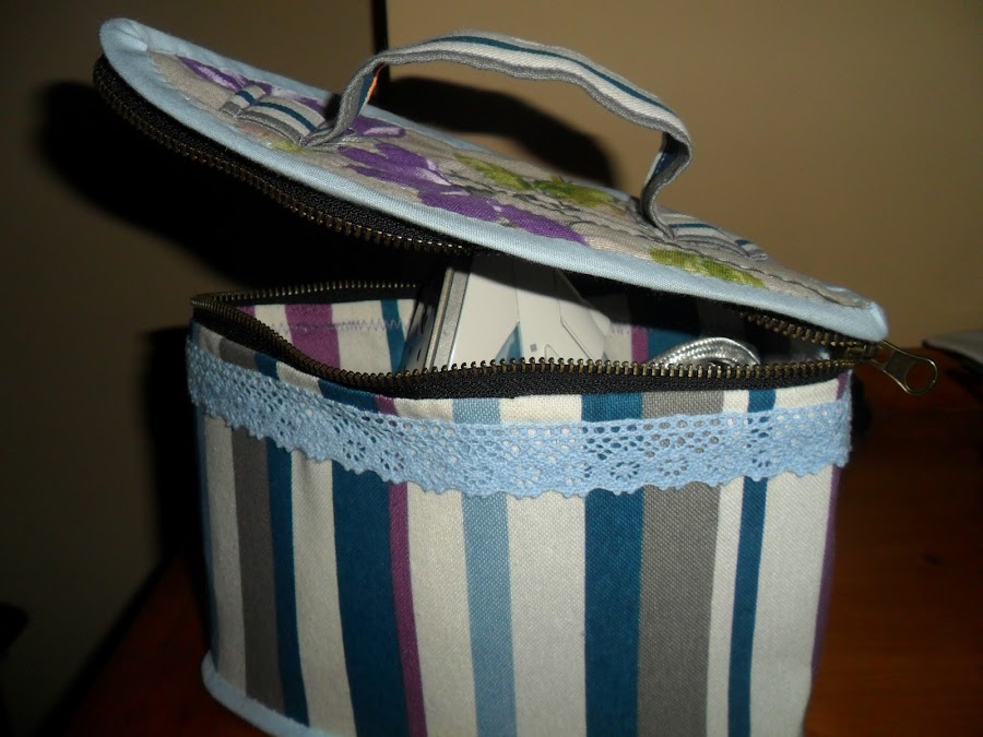 Las tapas superior e inferior las acolche antes de montarlas, y limpie todo con cinta al bies azul, aplicada a mano.