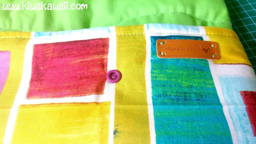 Las telas, en el exterior un algodón de patchwork que me compré en Almería, me encanta la energía que transmiten estos colores... en el interior, loneta fina de color verde claro. Como refuerzo para dar cuerpo lleva fieltro, y para acolchar guata de la más gruesa.