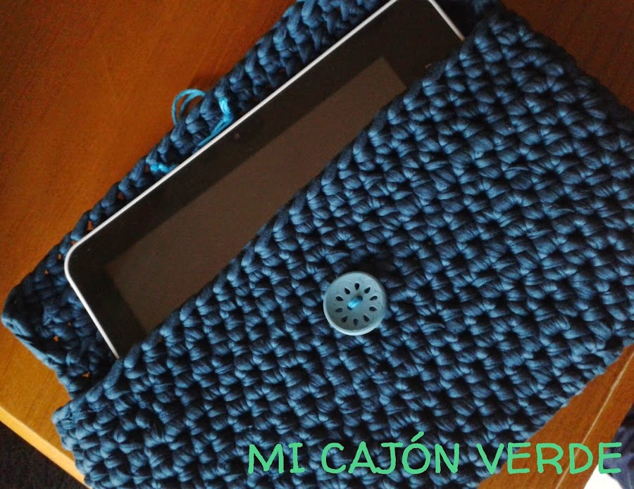 Para hacer la tablet he usado trapillo de los chinos, sí de los chinos y un crochet de 5mm porque no tenía de 6mm pero bueno ha quedado muy bien. La he hecho con puntos varetta/altos.