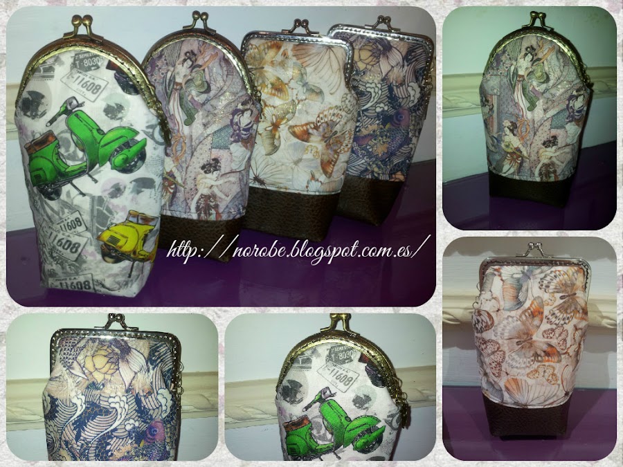 Las cuatro están realizadas de la misma manera: se componen de una boquilla metálica de unos 9 cm, las redondeadas son de color bronce mientras que las más rectangulares son de color plateado; cada una lleva un charm de adorno del color de la boquilla correspondiente; las telas exteriores son de algodón y tienen un aire oriental, son algunas de las últimas telas que compré que me gustaron tanto, algunas de ellas van combinadas con polipiel marrón; interiormente van forradas con foam y con una tela de forro de algodón de colores beis o rosa.