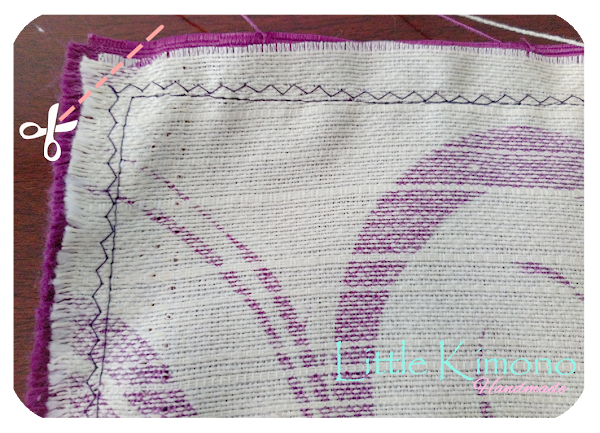4. Una vez hecho ésto, cosemos los 3 laterales que no tienen el dobladillo. Yo suelo dar una puntada normal y otra en zig-zag y cortamos las 2 esquinas que llevan la costura.