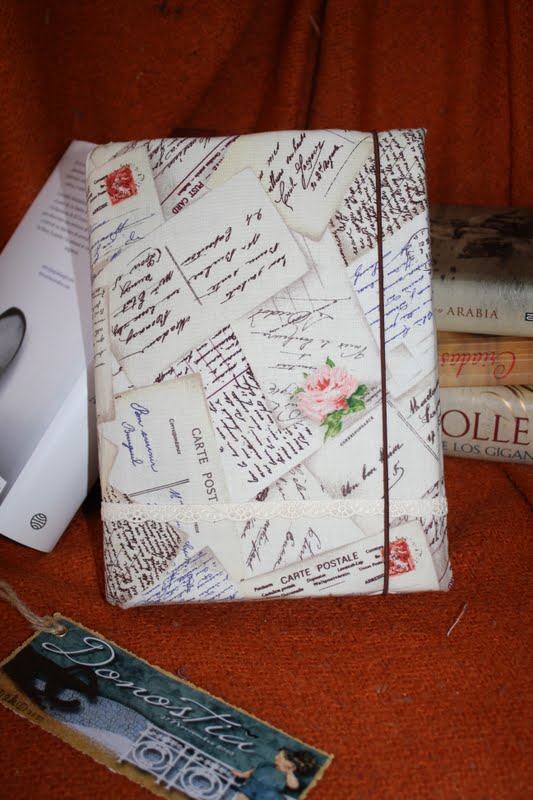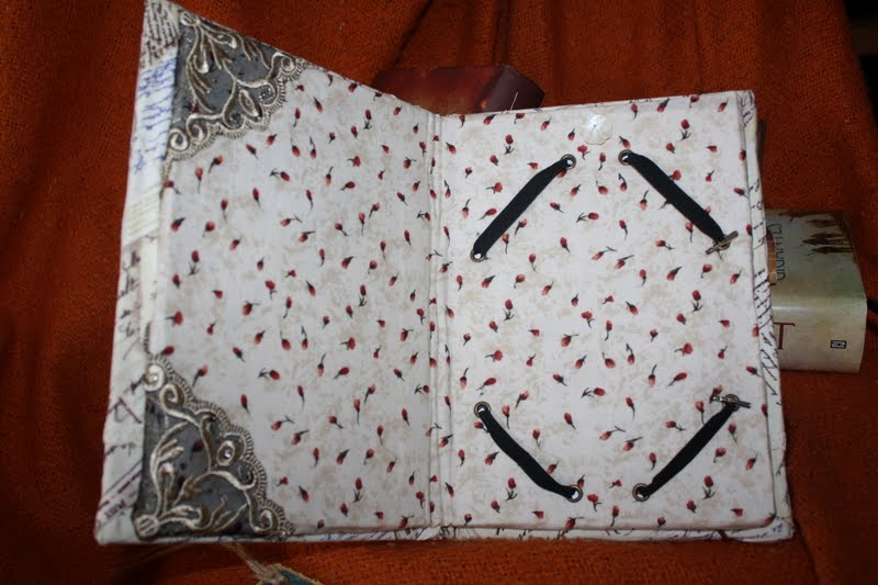 En fin, que es una funda para un ordenador de esos canijos. La hice con las tapas de una vieja agenda para darle la dureza necesaria........telas..........guata........botón de madera con el nombre del propietario........cuerda...........