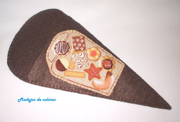 Y para el chico, fieltro marrón oscuro y de adorno, una aplicación de tela con un tarro lleno de galletas.