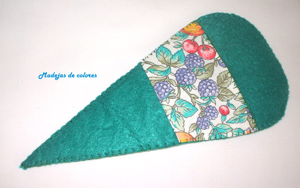 Para la de la chica, fieltro verde botella y como adorno una tela bien alegre con frutas, que destaca bastante con el fondo.