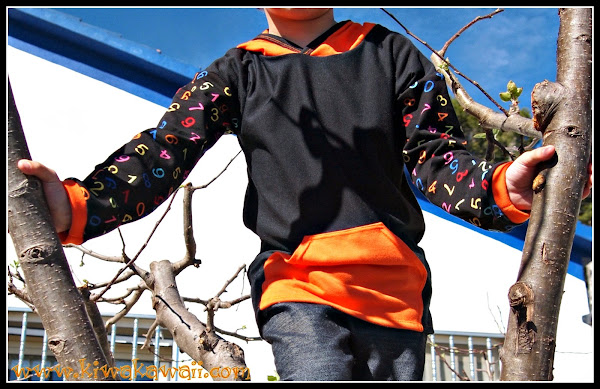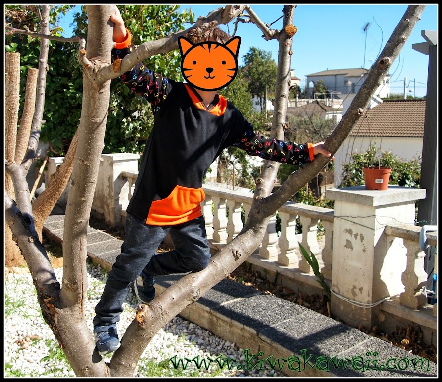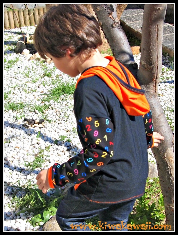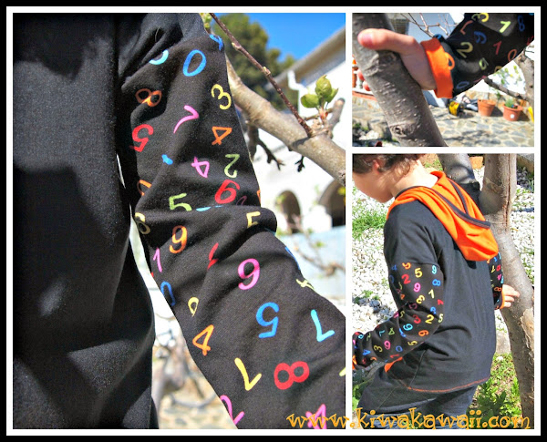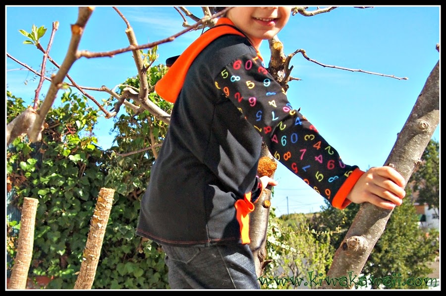 Las telas son todas de Cal Joan, punto liso de camiseta negro, otro naranja, y otro de números, y puños naranjas.